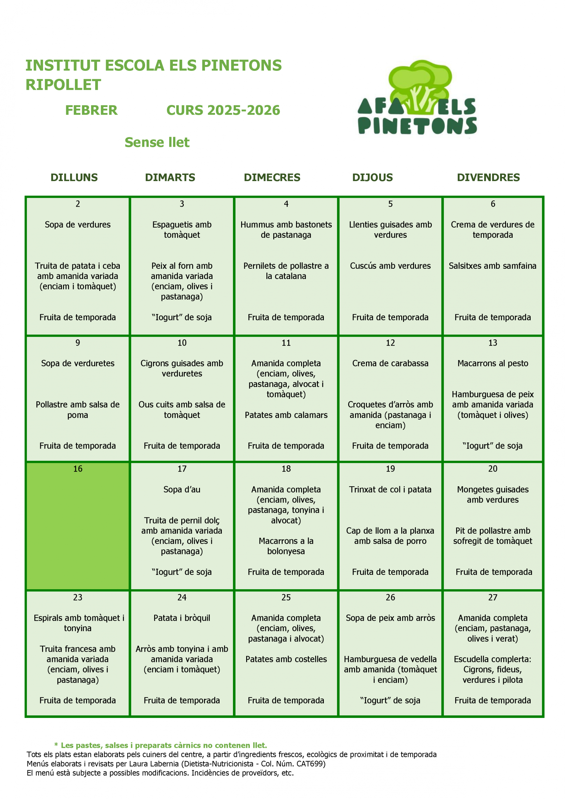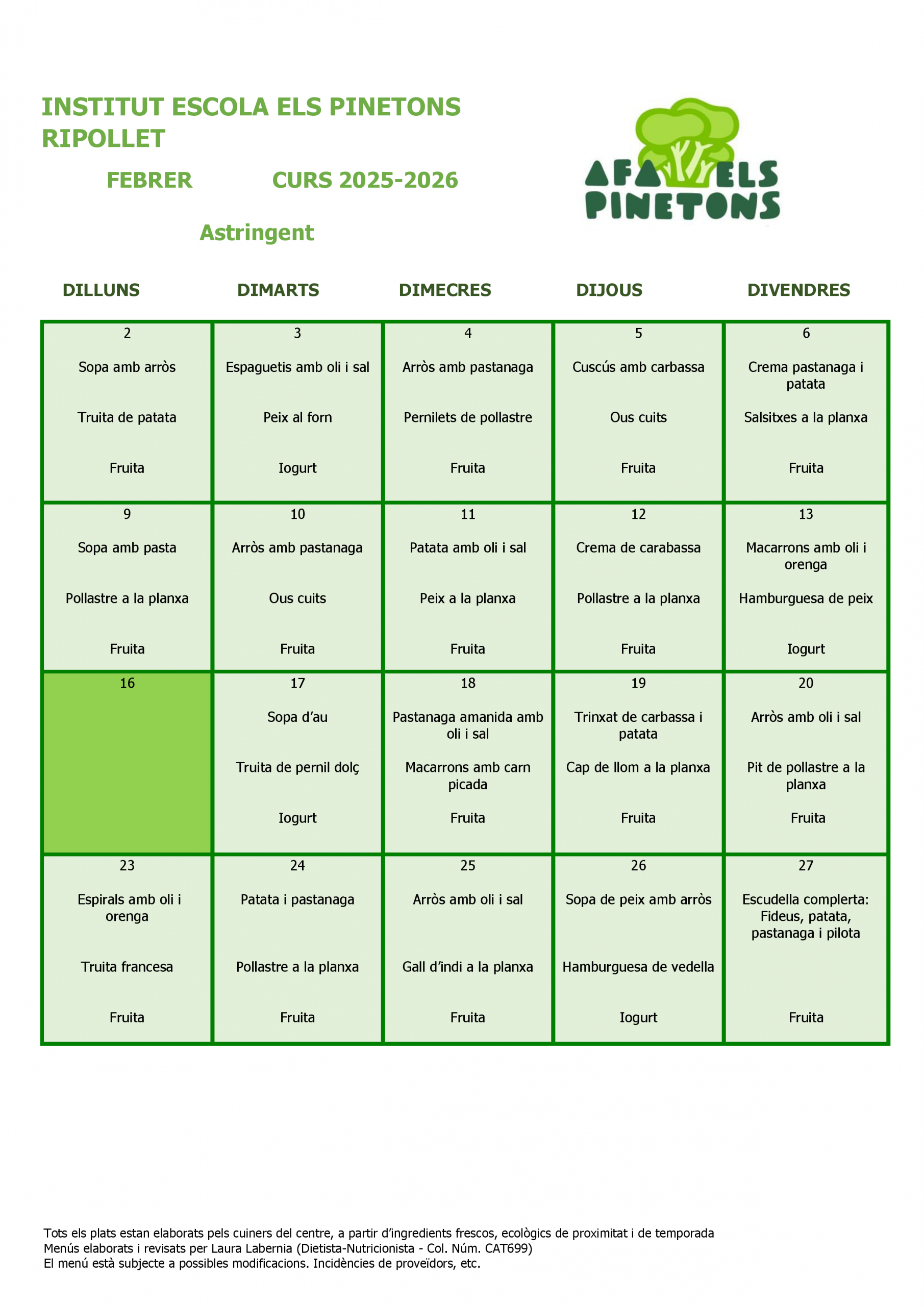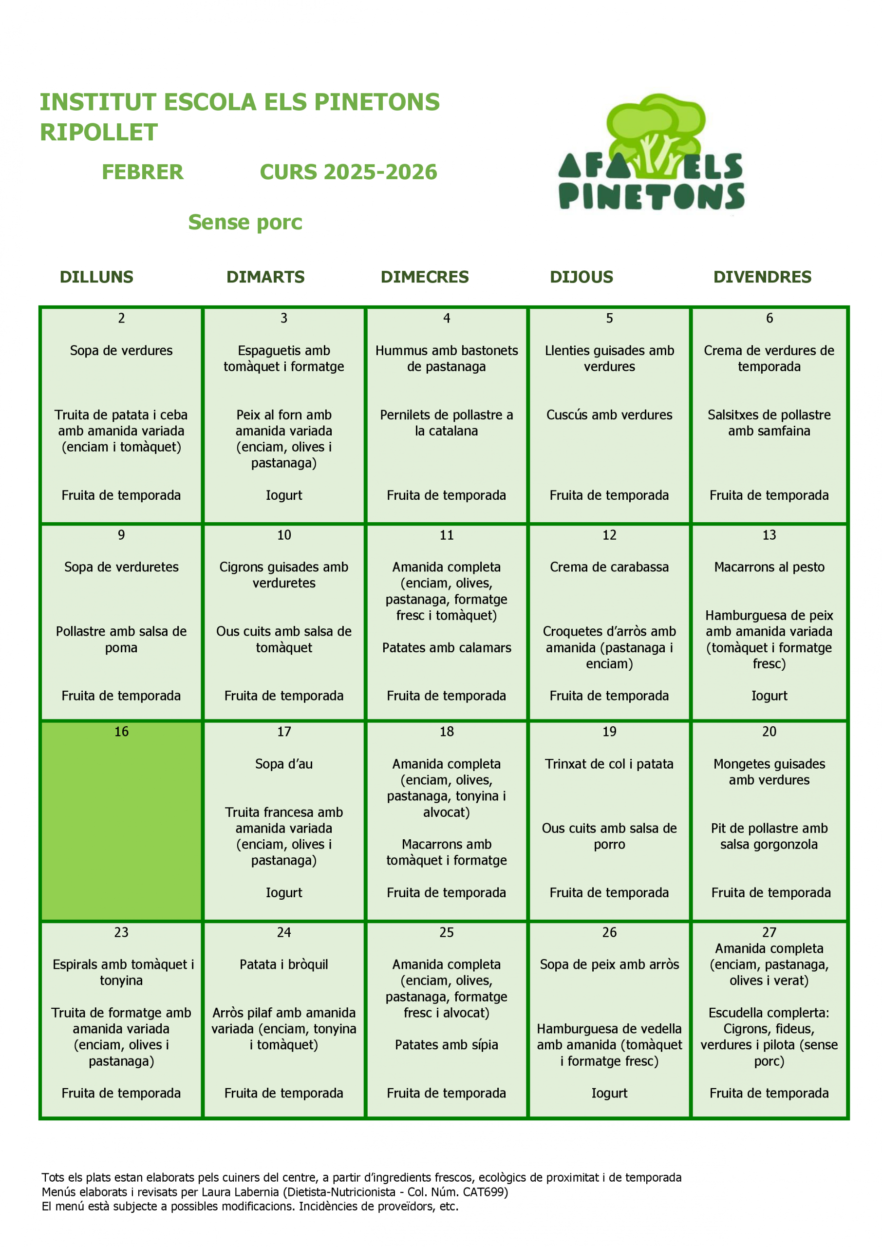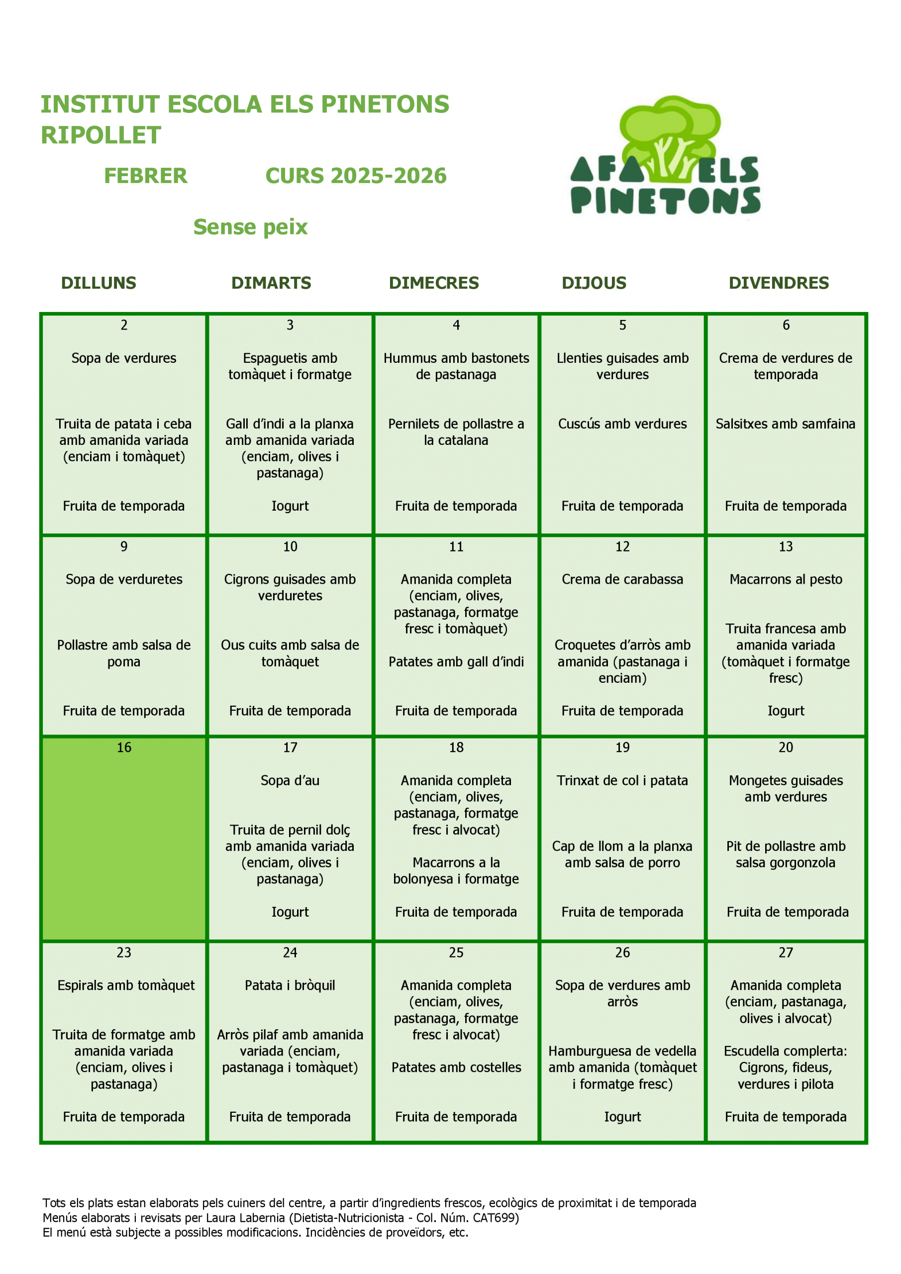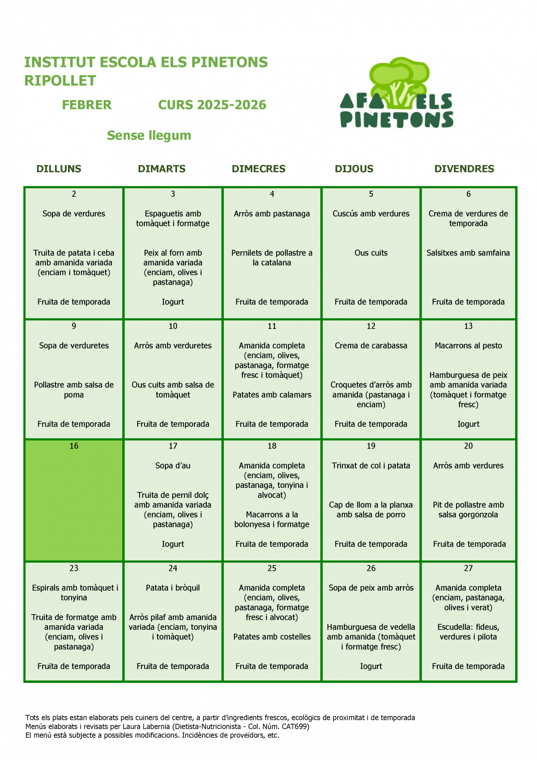Des del 2n trimestre del curs 2021/2022 vam encarregar a la Laura Labèrnia, la nutricionista que ens assessora, que elaborés una taula de gramatges i racions feta a mida en funció del nostre estil de cuina i productes frescos.