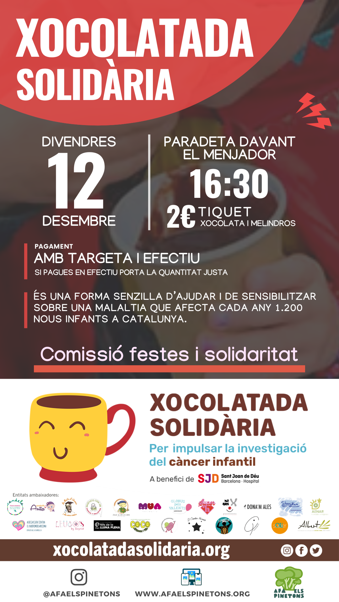 Des de la Comissió de Festes i solidaritat tornem a col·laborar amb la xocolatada solidària en benefici de l’Hospital Sant Joan de Déu amb la finalitat de recaptar fons per a la recerca del càncer infantil.